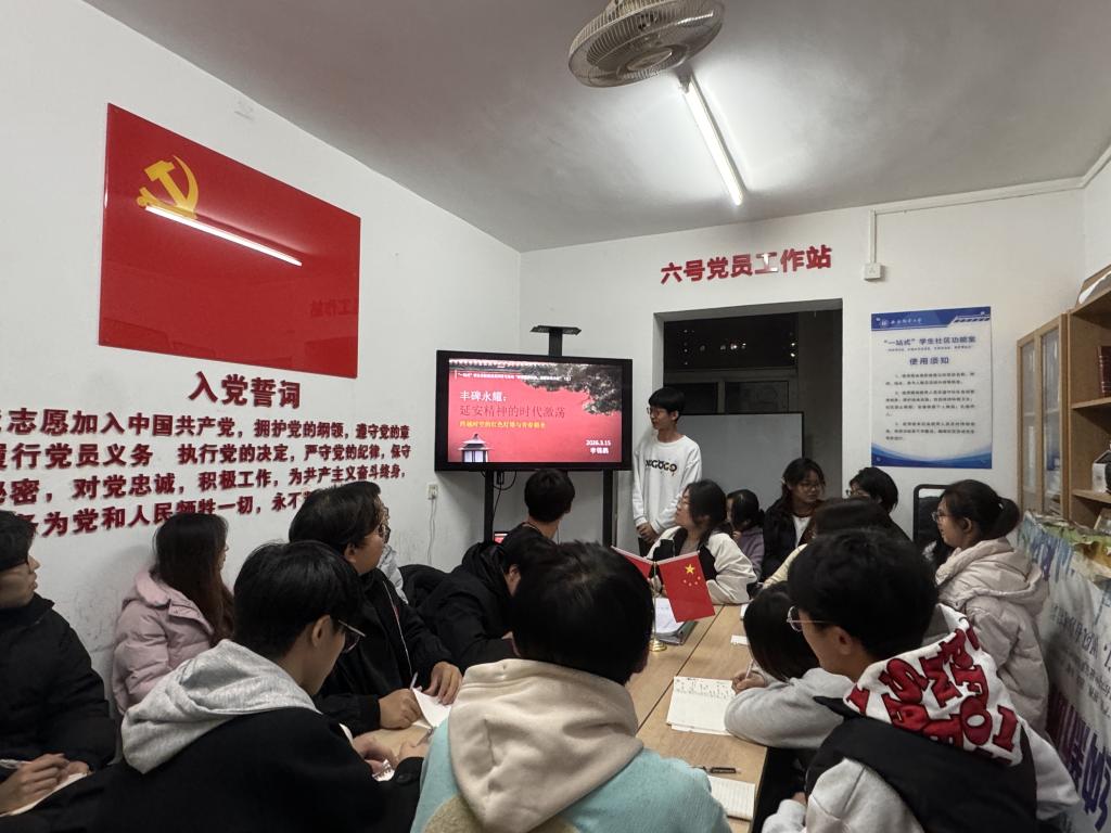 为深入推进“一站式”学生社区建设,引导广大青年学子从红色基因中汲取奋进力量,2026年3月15日,六号党员工作站在长智公寓六号楼135开展“赓续精神血脉,凝聚奋进力量”延安精神专题学习活动。本次活动由学习部李锦鹏同学主讲。他围绕延安精神的历史背景、核心内涵、典型体现与时代价值四个方面进行讲解,带领同学们走进那段峥嵘岁月,感悟伟大精神的时代回响。