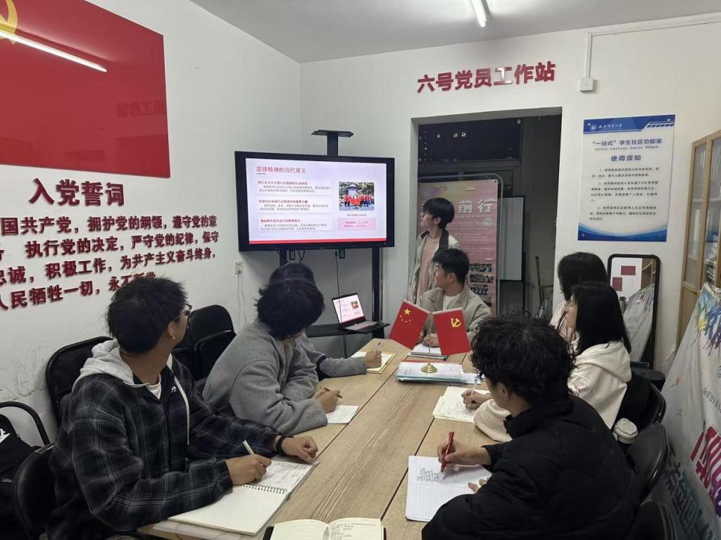 为深入弘扬雷锋精神,厚植青年学生理想信念,培育担当民族复兴大任的时代新人,2026年3月29日,六号党员工作站在长智公寓六号楼135室组织开展“赓续精神血脉,凝聚奋进力量”系列学习活动第五期。本次学习以“雷锋精神的时代传承与价值”为主题,由组织部李天辰担任主讲,六号党员工作站全体成员参与学习,推动雷锋精神在青年群体中落地生根、薪火相传。